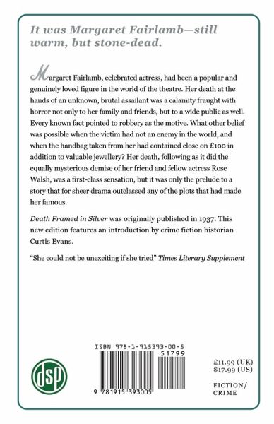 It was Margaret Fairlamb-still warm, but stone-dead. Margaret Fairlamb, celebrated actress, had been a popular and genuinely loved figure in the world of the theatre. Her death at the hands of an unknown, brutal assailant was a calamity fraught with horror not only to her family and friends, but to a wide public as well. Every known fact pointed to robbery as the motive. What other belief was possible when the victim had not an enemy in the world, and when the handbag taken from her had contained close on £100 in addition to valuable jewellery? Her death, following as it did the equally mysterious demise of her friend and fellow actress Rose Walsh, was a first-class sensation, but it was only the prelude to a story that for sheer drama outclassed any of the plots that had made her famous. Death Framed in Silver was originally published in 1937. This new edition features an introduction by crime fiction historian Curtis Evans. "She could not be unexciting if she tried" Times Literary Supplement
