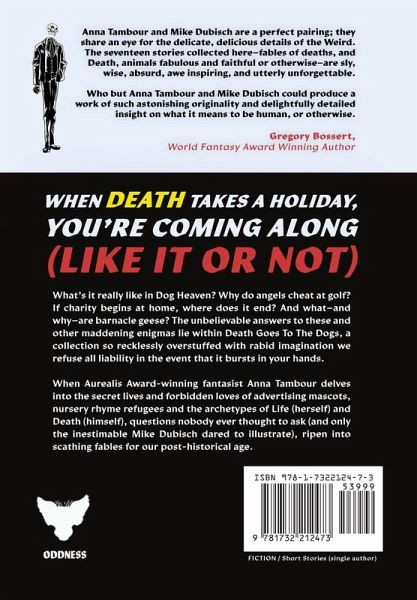 When Death Takes A Holiday, You're Coming Along (like it or not) What's it really like in Dog Heaven? Why do angels cheat at golf? If charity begins at home, where does it end? And what-and why-are barnacle geese? The unbelievable answers to these and other maddening enigmas lie within Death Goes To The Dogs, a collection so recklessly overstuffed with rabid imagination we refuse all liability in the event that it bursts in your hands. When Aurealis Award-winning fantasist Anna Tambour delves into the secret lives and forbidden loves of advertising mascots, nursery rhyme refugees and the archetypes of Life (herself) and Death (himself), questions nobody ever thought to ask (and only the inestimable Mike Dubisch dared to illustrate), ripen into scathing fables for our post-historical age.