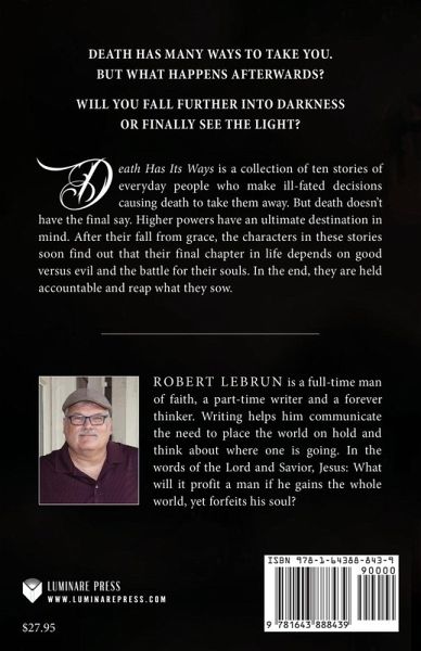 Death has many ways to take you. But what happens afterwards? Will you fall further into darkness or finally see the light? Death Has Its Ways is a collection of ten stories of everyday people who make ill-fated decisions causing death to take them away. But death doesn't have the final say. Higher powers have an ultimate destination in mind. After their fall from grace, the characters in these stories soon find out that their final chapter in life depends on good versus evil and the battle for their souls. In the end, they are held accountable and reap what they sow.