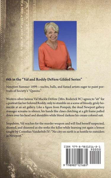 Newport Summer 1899-yachts, balls, and famed artists eager to paint portraits of Society's "Queens." Western silver heiress Val Mackle DeVere (Mrs. Roderick W.) agrees to "sit" for a portrait for her beloved Roddy, only to stumble on a scene of bloody, grisly homicide at an art gallery. Like a figure from Pompeii, the dead Newport gallery manager screams in silence, his hands like claws clutching at a gilt frame pulled down over his head and shoulders while blood darkens his cream-colored suit. Impulsive, Val reaches for the murder weapon and will find herself suspected, shamed, and shunned as she seeks the killer while learning yet again a lesson taught by Cornelius Vanderbilt IV: "No city on earth is as hostile to outsiders as Newport."