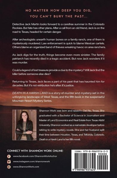 No matter how deep you dig, you can't bury the past. Detective Jack Martin looks forward to a carefree summer in the Colorado Rockies. But fate has other plans. After a call from an old friend, Jack is on the road to Texas, headed for certain danger. After archeologists unearth human bones on a family ranch, one of them is mysteriously murdered. Law enforcement is quick to blame Mexican cartels. Others blame an organized band of thieves wreaking havoc on area ranchers. As Jack digs for the truth, things become even more sinister. The family patriarch has recently died in a tragic accident. But now Jack wonders if it was murder. Could a legend of lost treasure provide a clue to the mystery? Will Jack find the killer before someone else dies? Returning to Texas, Jack faces a part of his past that has haunted him for decades. But it's not retribution he's after. It's justice. DEATH IN A HARSH LAND is a story of murder and mystery set in the unforgiving landscape of West Texas, and the fifth book in the suspenseful Mountain Resort Mystery Series.