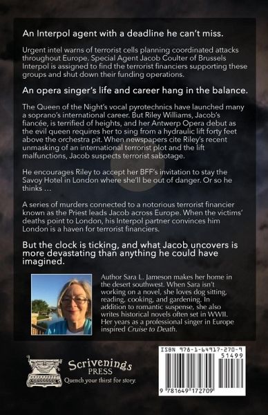 An Interpol agent with a deadline he can't miss. Urgent intel warns of terrorist cells planning coordinated attacks throughout Europe. Special Agent Jacob Coulter of Brussels Interpol is assigned to find the terrorist financiers supporting these groups and shut down their funding operations. An opera singer's life and career hang in the balance. The Queen of the Night's vocal pyrotechnics have launched many a soprano's international career. But Riley Williams, Jacob's fiancée, is terrified of heights, and her Antwerp Opera debut as the evil queen requires her to sing from a hydraulic lift forty feet above the orchestra pit. When newspapers cite Riley's recent unmasking of an international terrorist plot and the lift malfunctions, Jacob suspects terrorist sabotage. He encourages Riley to accept her BFF's invitation to stay the Savoy Hotel in London where she'll be out of danger. Or so he thinks ... A series of murders connected to a notorious terrorist financier known as the Priest leads Jacob across Europe. When the victims' deaths point to London, his Interpol partner convinces him London is a haven for terrorist financiers. But the clock is ticking and what Jacob uncovers is more devastating than anything he could have imagined.