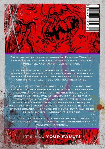 From the worm-infested brain of Zebulon Whatley comes an interactive tale of savage magic, brutal violence, and pants-filling terror. In an ancient world forsaken by all but the most depraved and bestial gods, lusty barbarians battle ghastly monsters in endless waves of gory combat. And worst of all... you control their fates! You, the most feared reader in all the lands, take control of the barbarous savage Gorm, the abyssal abomination Chytin, or the mind-bogglingly monstrous Tordleth, as you guide them to their ultimate destinies. Will you ascend to the heights of power, slaughter cosmic beasts older than time itself, pee your pants as you stupidly fall into a nest of subterranean horrors, or figure out a way to do something even weirder and worse? Blood and teeth will fly, endless guts will be spilt, and no flesh shall be spared. And remember that whatever happens... it's all your fault!