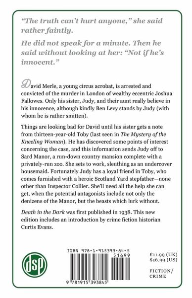 "The truth can't hurt anyone," she said rather faintly. He did not speak for a minute. Then he said without looking at her. "Not if he's innocent." David Merle, a young circus acrobat, is arrested and convicted of the murder in London of wealthy eccentric Joshua Fallowes. Only his sister, Judy, and their aunt really believe in his innocence, although kindly Ben Levy stands by Judy (with whom he is rather smitten). Things are looking bad for David until his sister gets a note from thirteen-year-old Toby (last seen in The Mystery of the Kneeling Woman). He has discovered some points of interest concerning the case, and this information sends Judy off to Sard Manor, a run-down country mansion complete with a privately-run zoo. She sets to work, sleuthing as an undercover housemaid. Fortunately Judy has a loyal friend in Toby, who comes furnished with a heroic Scotland Yard stepfather-none other than Inspector Collier. She'll need all the help she can get, when the potential antagonists include not only the denizens of the Manor, but the beasts which lurk without. Death in the Dark was first published in 1938. This new edition includes an introduction by crime fiction historian Curtis Evans.