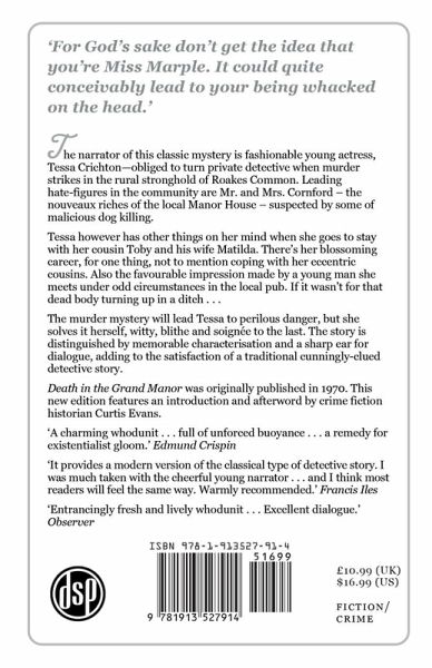 'For God's sake don't get the idea that you're Miss Marple. It could quite conceivably lead to your being whacked on the head.' The narrator of this classic mystery is fashionable young actress, Tessa Crichton-obliged to turn private detective when murder strikes in the rural stronghold of Roakes Common. Leading hate-figures in the community are Mr. and Mrs. Cornford - the nouveaux riches of the local Manor House - suspected by some of malicious dog killing. Tessa however has other things on her mind when she goes to stay with her cousin Toby and his wife Matilda. There's her blossoming career, for one thing, not to mention coping with her eccentric cousins. Also the favourable impression made by a young man she meets under odd circumstances in the local pub. If it wasn't for that dead body turning up in a ditch . . . The murder mystery will lead Tessa to perilous danger, but she solves it herself, witty, blithe and soignée to the last. The story is distinguished by memorable characterisation and a sharp ear for dialogue, adding to the satisfaction of a traditional cunningly-clued detective story. Death in the Grand Manor was originally published in 1970. This new edition features an introduction and afterword by crime fiction historian Curtis Evans. 'A charming whodunit . . . full of unforced buoyance . . . a remedy for existentialist gloom.' Edmund Crispin 'It provides a modern version of the classical type of detective story. I was much taken with the cheerful young narrator . . . and I think most readers will feel the same way. Warmly recommended.' Francis Iles 'Entrancingly fresh and lively whodunit . . . Excellent dialogue.' Observer