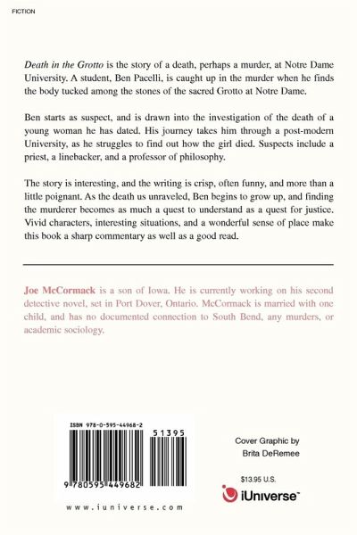 Death in the Grotto is the story of a death, perhaps a murder, at Notre Dame University. A student, Ben Pacelli, is caught up in the murder when he finds the body tucked among the stones of the sacred Grotto at Notre Dame. Ben starts as suspect, and is drawn into the investigation of the death of a young woman he has dated. His journey takes him through a post-modern University, as he struggles to find out how the girl died. Suspects include a priest, a linebacker, and a professor of philosophy. The story is interesting, and the writing is crisp, often funny, and more than a little poignant. As the death is unraveled, Ben begins to grow up, and finding the murderer becomes as much a quest to understand as a quest for justice. Vivid characters, interesting situations, and a wonderful sense of place make this book a sharp commentary as well as a good read.