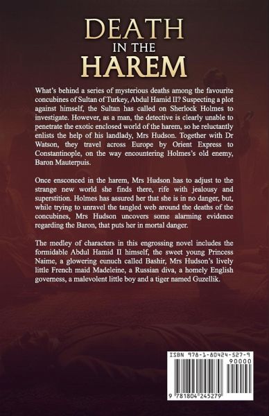 What's behind a series of mysterious deaths among the favourite concubines of Sultan of Turkey, Abdul Hamid II? Suspecting a plot against himself, the Sultan has called on Sherlock Holmes to investigate. However, as a man, the detective is clearly unable to penetrate the exotic enclosed world of the harem, so he reluctantly enlists the help of his landlady, Mrs Hudson. Together with Dr Watson, they travel across Europe by Orient Express to Constantinople, on the way encountering Holmes's old enemy, Baron Mauterpuis. Once ensconced in the harem, Mrs Hudson has to adjust to the strange new world she finds there, rife with jealousy and superstition. Holmes has assured her that she is in no danger, but, while trying to unravel the tangled web around the deaths of the concubines, Mrs Hudson uncovers some alarming evidence regarding the Baron, that puts her in mortal danger. The medley of characters in this engrossing novel includes the formidable Abdul Hamid II himself, the sweet young Princess Naime, a glowering eunuch called Bashir, Mrs Hudson's lively little French maid Madeleine, a Russian diva, a homely English governess, a malevolent little boy and a tiger named Guzellik.