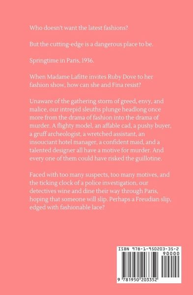 ¿Who doesn't want the latest fashions? But the cutting-edge is a dangerous place to be. Springtime in Paris, 1936. When Madame Lafitte invites Ruby Dove to her fashion show, how can she and Fina resist? Unaware of the gathering storm of greed, envy, and malice, our intrepid sleuths plunge headlong once more from the drama of fashion into the drama of murder. A flighty model, an affable cad, a pushy buyer, a gruff archeologist, a wretched assistant, an insouciant hotel manager, a confident maid, and a talented designer all have a motive for murder. And every one of them could have risked the guillotine. Faced with too many suspects, too many motives, and the ticking clock of a police investigation, our detectives wine and dine their way through Paris, hoping that someone will slip. Perhaps a Freudian slip, edged with fashionable lace? If you love golden age detection with a dash of history, join our fashionable Oxford sleuth-spies in a delightful mystery romp through the 1930s. Ruby and Fina wager that you'll never guess who did it.