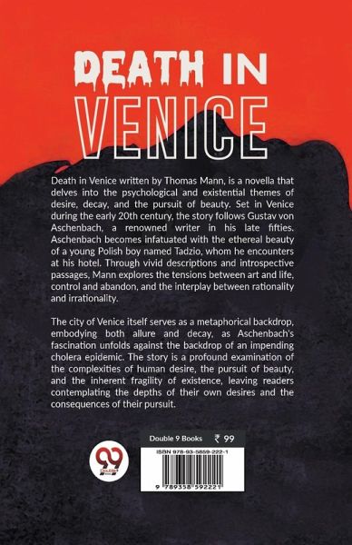 Death in Venice written by Thomas Mann, is a novella that delves into the psychological and existential themes of desire, decay, and the pursuit of beauty. Set in Venice during the early 20th century, the story follows Gustav von Aschenbach, a renowned writer in his late fifties. Aschenbach becomes infatuated with the ethereal beauty of a young Polish boy named Tadzio, whom he encounters at his hotel. Through vivid descriptions and introspective passages, Mann explores the tensions between art and life, control and abandon, and the interplay between rationality and irrationality. The city of Venice itself serves as a metaphorical backdrop, embodying both allure and decay, as Aschenbach's fascination unfolds against the backdrop of an impending cholera epidemic. The story is a profound examination of the complexities of human desire, the pursuit of beauty, and the inherent fragility of existence, leaving readers contemplating the depths of their own desires and the consequences of their pursuit.