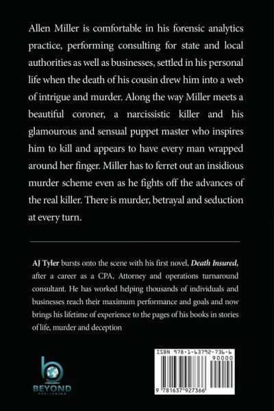 Allen Miller is comfortable in his forensic analytics practice, performing consulting for state and local authorities as well as businesses, settled in his personal life when the death of his cousin drew him into a web of intrigue and murder. Along the way Miller meets a beautiful coroner, a narcissistic killer and his glamourous and sensual puppet master who inspires him to kill and appears to have every man wrapped around her finger. Miller has to ferret out an insidious murder scheme even as he fights off the advances of the real killer. There is murder, betrayal and seduction at every turn. About the Author AJ Tyler bursts onto the scene with his first novel, Death Insured, after a career as a CPA, Attorney and operations turnaround consultant. He has worked helping thousands of individuals and businesses reach their maximum performance and goals and now brings his lifetime of experience to the pages of his books in stories of life, murder and deception