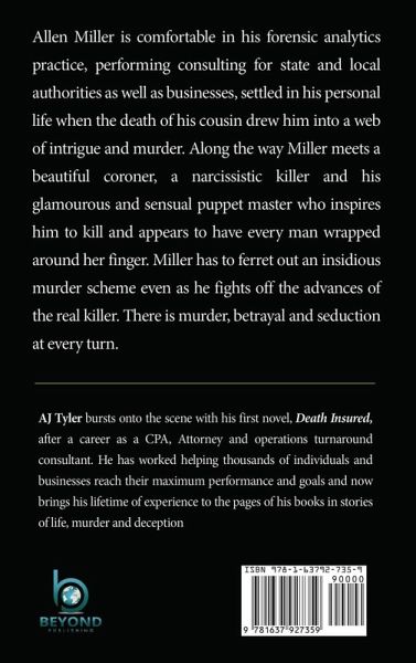 Allen Miller is comfortable in his forensic analytics practice, performing consulting for state and local authorities as well as businesses, settled in his personal life when the death of his cousin drew him into a web of intrigue and murder. Along the way Miller meets a beautiful coroner, a narcissistic killer and his glamourous and sensual puppet master who inspires him to kill and appears to have every man wrapped around her finger. Miller has to ferret out an insidious murder scheme even as he fights off the advances of the real killer. There is murder, betrayal and seduction at every turn. About the Author AJ Tyler bursts onto the scene with his first novel, Death Insured, after a career as a CPA, Attorney and operations turnaround consultant. He has worked helping thousands of individuals and businesses reach their maximum performance and goals and now brings his lifetime of experience to the pages of his books in stories of life, murder and deception