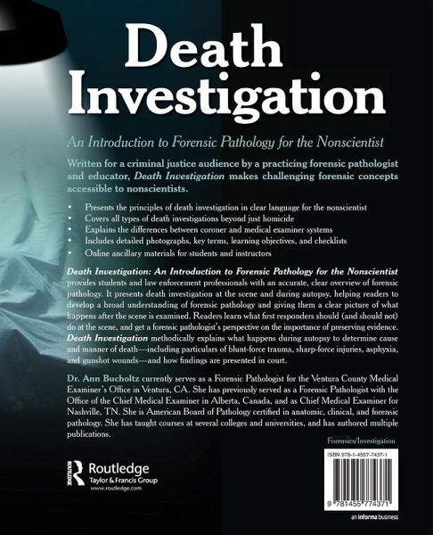 Death Investigation: An Introduction to Forensic Pathology for the Nonscientist provides students and law enforcement professionals with an accurate, clear overview of forensic pathology. It presents death investigation at the scene and autopsy, providing readers with a broad understanding of forensic pathology and giving them a clear picture of what happens after the examination of the scene. Readers learn what first responders should (and should not) do at the scene, and get a forensic pathologist's perspective on the importance of preserving evidence. Death Investigation methodically explains what happens during autopsy to determine cause and manner of death - including particulars of blunt-force trauma, sharp-force injuries, asphyxia, and gunshot wounds - and how findings are presented in court. Written for a criminal justice audience by a practicing forensic pathologist and educator, Death Investigation makes challenging forensics concepts accessible to nonscientists.