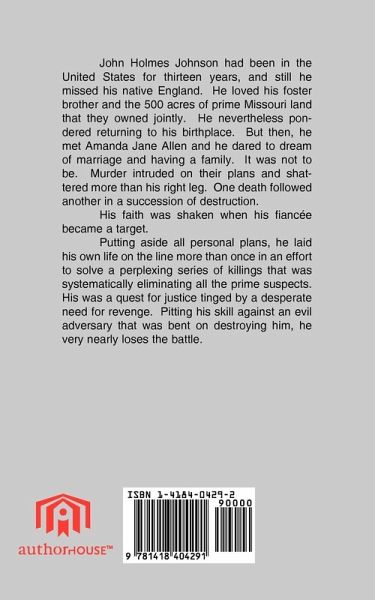 John Holmes Johnson had been in the United States for thirteen years, and still he missed his native England. He loved his foster brother and the 500 acres of prime Missouri land that they owned jointly. He nevertheless pondered returning to his birthplace. But then, he met Amanda Jane Allen and he dared to dream of marriage and having a family. It was not to be. Murder intruded on their plans and shattered more than his right leg. One death followed another in a succession of destruction. His faith was shaken when his fiancée became a target. Putting aside all personal plans, he laid his own life on the line more than once in an effort to solve a perplexing series of killings that was systematically eliminating all the prime suspects. His was a quest for justice tinged by a desperate need for revenge. Pitting his skill against an evil adversary that was bent on destroying him, he very nearly loses the battle.