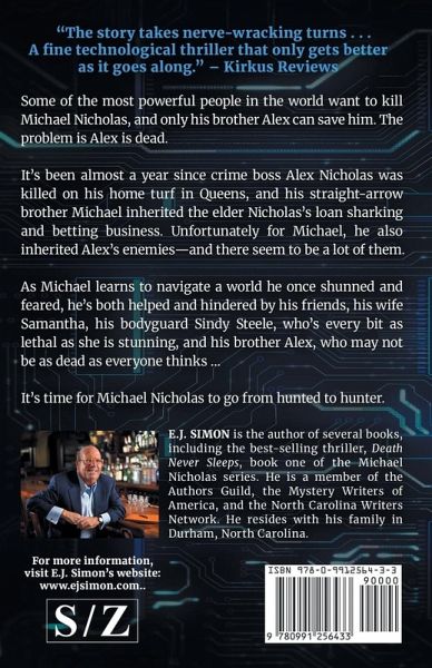 Some of the most powerful people in the world want to kill Michael Nicholas. Only his brother, Alex can save him - the problem is that Alex is dead. It's been almost a year since Alex Nicholas, a Queens based underworld Boss, was gunned down. After Alex's brutal murder, Michael inherited not only his brother's business - but his enemies. Michael is now a key player in a world he once feared. By day, he is the head of a Fortune 500 company by night, the CEO of Tartarus, one of the worlds largest illegal gambling operations. Before his death, Alex invested heavily in breakthrough artificial intelligence software so that he could live forever. It worked. In his virtual form, Alex can communicate with Michael and monitor information - and people - in ways the NSA would envy. It is Alex who discovers Michael's life is in danger. He detects plots that reach from the darkest corners of Queens, to the highest officials in the Vatican - and they all want Michael dead. Michael is now in a race to save his life, but he is never alone - Alex is there to help him navigate through this maze of life and death. Also protecting Michael from the forces closing in around him is Sindy Steele, a beautiful - and lethal bodyguard. How far is Michael willing to go to save his own life - and that of his family? Guided only by a familiar face on a computer screen, will the information Alex discovers allow Michael to go from being the hunted to the hunter?