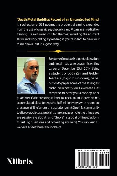 'Death Metal Buddha: Record of an Uncontrolled Mind' is a collection of 531 poems, the product of a mind expanded from the use of organic psychedelics and Vipassana meditation training. It's sectioned into ten themes, including the abstract, satire and story telling. By reading it, you're meant to have your mind blown, but in a good way.