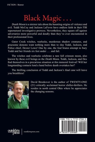 Death Moon is a sinister tale about the haunting origins of violence and evil. Teddi McCoy and Jackson LaFevre have endless faith in their FBI supernatural investigative prowess. Nevertheless, they square off against adversaries more powerful and deadly than they've ever encountered in their professional lives. Gator Creek witches, warlocks, murderous shadow creatures, and gruesome demons want nothing more than to slay Teddi, Jackson, and Police chief, Dexter Lowe! One by one, the foul brutes attempt to bury Teddi and her friends six feet under . . . and fail. The witches and warlocks celebrate a rare full crimson moon, also known by these evil beings as the Death Moon. Teddi, Jackson, and Dex find themselves in a precarious situation at this immoral festival! Will her longstanding contacts lend a hand before death overtakes her? The thrilling conclusion of Teddi and Jackson's final case will leave you breathless!