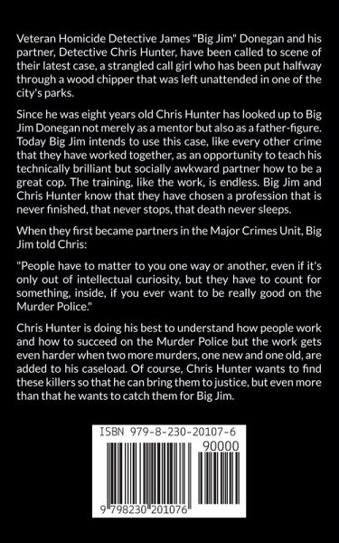 Veteran Homicide Detective James "Big Jim" Donegan and his partner, Detective Chris Hunter, have been called to scene of their latest case, a strangled call girl who has been put halfway through a wood chipper that was left unattended in one of the city's parks. Since he was eight years old Chris Hunter has looked up to Big Jim Donegan not merely as a mentor but also as a father-figure. Today Big Jim intends to use this case, like every other crime that they have worked together, as an opportunity to teach his technically brilliant but socially awkward partner how to be a great cop. The training, like the work, is endless. Big Jim and Chris Hunter know that they have chosen a profession that is never finished, that never stops, that death never sleeps. When they first became partners in the Major Crimes Unit, Big Jim told Chris: "People have to matter to you one way or another, even if it's only out of intellectual curiosity, but they have to count for something, inside, if you ever want to be really good on the Murder Police." Chris Hunter is doing his best to understand how people work and how to succeed on the Murder Police but the work gets even harder when two more murders, one new and one old, are added to his caseload. Of course, Chris Hunter wants to find these killers so that he can bring them to justice, but even more than that he wants to catch them for Big Jim.