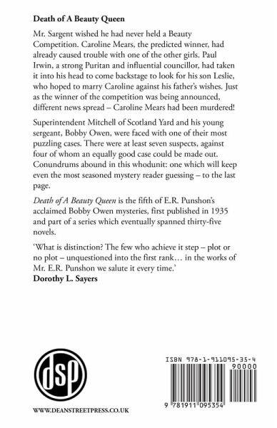 Mr. Sargent, the manager of the Brush Hill Central Cinema, wished he had never held a Beauty Competition. Caroline Mears, the predicted winner, had already caused trouble with one of the other girls. Paul Irwin, a strong Puritan and influential councillor, had taken it into his head to come backstage to look for his son Leslie, who hoped to marry Caroline against his father’s wishes. Just as the winner of the competition was being announced, different news spread through the cinema like lightning – Caroline Mears had been murdered! Superintendent Mitchell of Scotland Yard and his young sergeant, Bobby Owen, were faced with one of the most puzzling cases of their careers. There were at least seven suspects, against four of whom an equally good case could be made out. There was Paul Irwin’s maddening reiteration that he had ‘nothing to say’ to all questions, and a multitude of confusing evidence, none of which fitted the main jigsaw puzzle. Conundrums abound in this whodunit: one which will keep even the most seasoned mystery reader guessing – right to the very last page. Death of A Beauty Queen is the fifth of E.R. Punshon’s acclaimed Bobby Owen mysteries, first published in 1935 and part of a series which eventually spanned thirty-five novels. "What is distinction? The few who achieve it step – plot or no plot – unquestioned into the first rank… in the works of Mr. E.R. Punshon we salute it every time." Dorothy L. Sayers