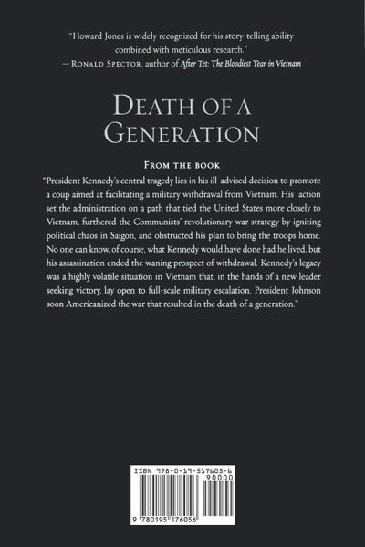 When John F. Kennedy was shot, millions were left to wonder how America, and the world, would have been different had he lived to fulfill the enormous promise of his presidency. For many historians and political observers, what Kennedy would and would not have done in Vietnam has been a source of enduring controversy. Now, based on convincing new evidence--including a startling revelation about the Kennedy administration's involvement in the assassination of Premier Diem--Howard Jones argues that Kennedy intended to withdraw the great bulk of American soldiers and pursue a diplomatic solution to the crisis in Vietnam. Drawing upon recently declassified hearings by the Church Committee on the U.S. role in assassinations, newly released tapes of Kennedy White House discussions, and interviews with John Kenneth Galbraith, Robert McNamara, Dean Rusk, and others from the president's inner circle, Jones shows that Kennedy firmly believed that the outcome of the war depended on the South Vietnamese. In the spring of 1962, he instructed Secretary of Defense McNamara to draft a withdrawal plan aimed at having all special military forces home by the end of 1965. The "Comprehensive Plan for South Vietnam" was ready for approval in early May 1963, but then the Buddhist revolt erupted and postponed the program. Convinced that the war was not winnable under Diem's leadership, President Kennedy made his most critical mistake--promoting a coup as a means for facilitating a U.S. withdrawal. In the cruelest of ironies, the coup resulted in Diem's death followed by a state of turmoil in Vietnam that further obstructed disengagement. Still, these events only confirmed Kennedy's view about South Vietnam's inability to win the war and therefore did not lessen his resolve to reduce the U.S. commitment. By the end of November, however, the president was dead and Lyndon Johnson began his campaign of escalation. Jones argues forcefully that if Kennedy had not been assassinated, his withdrawal plan would have spared the lives of 58,000 Americans and countless Vietnamese. Written with vivid immediacy, supported with authoritative research, Death of a Generation answers one of the most profoundly important questions left hanging in the aftermath of John F. Kennedy's death.