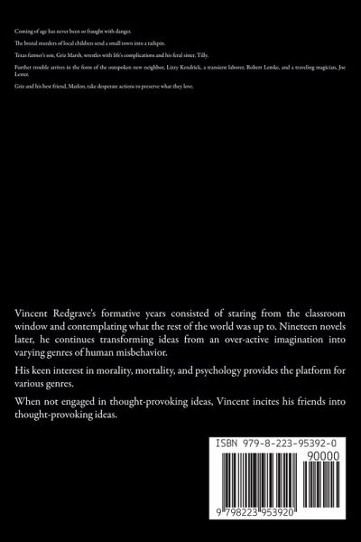 Coming of age has never been so fraught with danger. The brutal murders of local children send a small town into a tailspin. Texas farmer's son, Griz Marsh, wrestles with life's complications and his feral sister, Tilly. Further trouble arrives in the form of the outspoken new neighbor, Lizzy Kendrick, a transient laborer, Robert Lemke, and a traveling magician, Joe Lester. Griz and his best friend, Marlon, take desperate actions to preserve what they love.