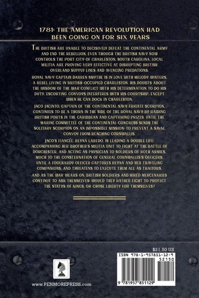By 1781, the American Revolution had been going on for six years. The British are unable to decisively defeat the Continental Army and end the rebellion. Even though the British Navy now controls the port city of Charleston, South Carolina, local militia are proving very effective at disrupting British overland supply lines and avenging predations. Royal Navy captain Darren Smythe is in love with Melody Winters, a rebel living in British-occupied Charleston. His doubts about the wisdom of the war conflict with his determination to do his duty. Escorting convoys interferes with his courtship, except when he can dock in Charleston. Jaco Jacinto, captain of the Continental Navy frigate Scorpion, continues to be a thorn in the side of the Royal Navy by raiding British ports in the Caribbean and capturing prizes. Until the Marine Committee of the Continental Congress sends the solitary Scorpion on an impossible mission: to prevent a naval convoy from reaching Cornwallis. Jaco's fiancée, Reyna Laredo, is leading a double life: accompanying her brother's militia unit to fight at the battle of Dorchester, and acting as physician to soldiers of both armies, much to the consternation of General Cornwallis's officers. Until a foolhardy officer captures Reyna and her traveling companions, and threatens to execute them all as traitors. And as the war wears on, British soldiers and hired mercenaries continue to ask themselves: would they rather fight to protect the status of kings, or chose liberty for themselves?