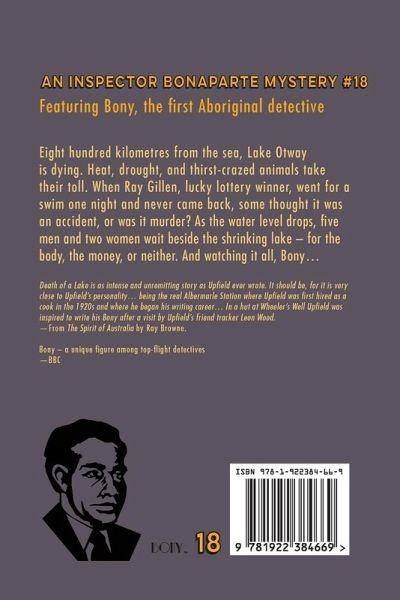Eight hundred kilometres from the sea, Lake Otway is dying. Heat, drought, and thirst-crazed animals take their toll. When Ray Gillen, lucky lottery winner, went for a swim one night and never came back, some thought it was an accident, or was it murder? As the water level drops, five men and two women wait beside the shrinking lake - for the body, the money, or neither. And watching it all, Bony… Death of a Lake is as intense and unremitting story as Upfield ever wrote. It should be, for it is very close to Upfield's personality ... being the real Albermarle Station where Upfield was first hired as a cook in the 1920s and where he began his writing career ... In a hut at Wheeler's Well Upfield was inspired to write his Bony after a visit by Upfield's friend tracker Leon Wood. - from The Spirit of Australia by Ray Browne. Bony - a unique figure among top-flight detectives - BBC