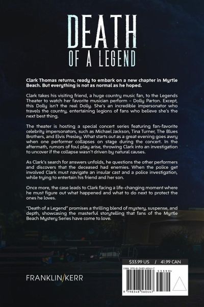 Clark Thomas returns, ready to embark on a new chapter in Myrtle Beach. But everything is not as normal as he hoped. Clark takes his visiting friend, a huge country music fan, to the Legends Theater to watch her favorite musician perform - Dolly Parton. Except, this Dolly isn't the real Dolly. She's an incredible impersonator who travels the country, entertaining legions of fans who believe she's the next best thing. The theater is hosting a special concert series featuring fan-favorite celebrity impersonators, such as Michael Jackson, Tina Turner, The Blues Brothers, and Elvis Presley. What starts out as a great evening goes awry when one performer collapses on stage during the concert. In the aftermath, rumors of foul play arise, throwing Clark into an investigation to uncover if the collapse wasn't driven by natural causes. As Clark's search for answers unfolds, he questions the other performers and discovers that the deceased had enemies. When the police get involved Clark must navigate an insular cast and a police investigation, while trying to entertain his friend and her son. Once more, the case leads to Clark facing a life-changing moment where he must figure out what happened and what to do next to protect the ones he loves. "Death of a Legend" promises a thrilling blend of mystery, suspense, and depth, showcasing the masterful storytelling that fans of the Myrtle Beach Mystery Series have come to love.