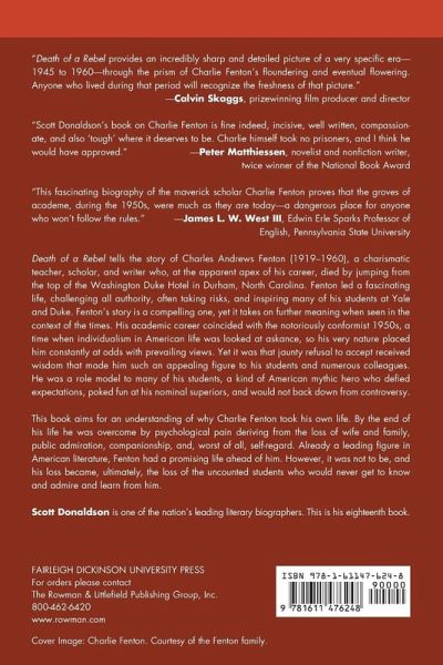 Death of a Rebel tells the story of Charles Andrews Fenton (1919-1960), a charismatic teacher, scholar, and writer who took his own life by jumping from the top of the Washington Duke Hotel in Durham, North Carolina. The book recounts Fenton’s last days in vivid detail. In writing it, Donaldson had the assistance of family members, of his devoted students, and even – at a painful distance – of the woman he fell in love with fifty years ago. They all share an abiding sense of what might have been, and a deep regret that he could not go on to inspire the uncounted students who would never get to know and admire and learn from him.