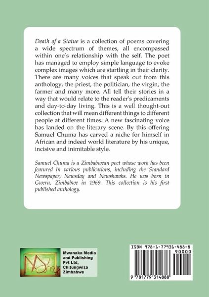 Death of a Statue is a collection of poems covering a wide spectrum of themes, all encompassed within one's relationship with the self. The poet has managed to employ simple language to evoke complex images which are startling in their clarity. There are many voices that speak out from this anthology, the priest, the politician, the virgin, the farmer and many more. All tell their stories in a way that would relate to the reader's predicaments and day to day living. This is a well thought-out collection that will mean different things to different people at different times. A new fascinating voice has landed on the literary scene. By this offering Samuel Chuma has carved a niche for himself in African and indeed world literature by his unique, incisive and inimitable style. Samuel Chuma is a Zimbabwean poet whose work has been featured in various publications including the Standard Newspaper, Newsday and Newshawks. He was born in Gweru, Zimbabwe in 1969. This collection is his first published anthology.