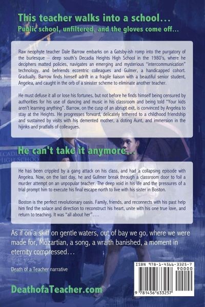 This teacher walks into a school…. "It’s not all about her…" Raw neophyte teacher Dale Barrow embarks on a reflective romp into the purgatory of the burlesque – deep south’s Decadia Heights High School in the 1980’s. All is well for a while as he navigates new technologies ("SchoolNip" – the cutting-edge intercommunication computer tool) and befriends a handicapped colleague, Gullmer. But he gradually finds himself caught in the ever-weaving orb of a sinister murder scheme and a platonic affair. Barrow strives to decipher eccentric characters, deformed policies, and the profundity of loss in many forms – one of which is his being censured by authorities for using the modalities of dancing and music in his classroom. Yet at his nadir, beautiful senior student Angelea convinces him to stay in teaching; thus their platonic affair amplifies, aggravating his emotional fragility. The tethers of a childhood friendship, visits with his demented mother, a doting Aunt, and his own search for universality sustain him further. Finally, he and Gullmer break through a door to save a despised teacher’s life, and redemption seems near, but a collapsing episode with Angelea and the pressures of a murder trial prompt him to execute his final escape north to live with his sister in Boston. Barrow, however, has escaped nothing inside himself, and must break free from his deep wounds. Serendipity, family, and friends help him find college-age Angelea in Boston. They are reunited forever, and he returns to teaching, his true passion. In the end, it was "all about her"…. Combine Gatsby(Fitzgerald), Invisible Man (Ellison), and some Orwellian spice, and emerge with Death of a Teacher, the tale of a young teacher’s escapades and lark of discovery in the public school system.