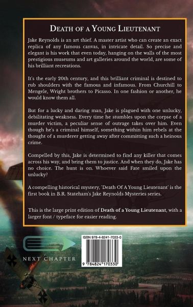 Jake Reynolds is an art thief. A master artist who can create an exact replica of any famous canvas, in intricate detail. So precise and elegant is his work that even today, hanging on the walls of the most prestigious museums and art galleries around the world, are some of his brilliant recreations. It's the early 20th century, and this brilliant criminal is destined to rub shoulders with the famous and infamous. From Churchill to Mengele, Wright brothers to Picasso. In one fashion or another, he would know them all. But for a lucky and daring man, Jake is plagued with one unlucky, debilitating weakness. Every time he stumbles upon the corpse of a murder victim, a peculiar sense of outrage takes over him. Even though he's a criminal himself, something within him rebels at the thought of a murderer getting away after committing such a heinous crime. Compelled by this, Jake is determined to find any killer that comes across his way, and bring them to justice. And when they do, Jake has no choice. The hunt is on. Whoever said Fate smiled upon the unlucky? A compelling historical mystery, 'Death Of A Young Lieutenant' is the first book in B.R. Stateham's Jake Reynolds Mysteries series. This is the large print edition of Death of a Young Lieutenant, with a larger font / typeface for easier reading.