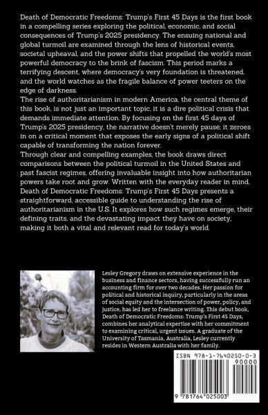The rise of authoritarianism in modern America, the central theme of this book, is not just an important topic, it is a dire political crisis that demands immediate attention. By focusing on the first 45 days of Trump's 2025 presidency, the narrative doesn't merely pause; it zeroes in on a critical moment that exposes the early signs of a political shift capable of transforming the nation forever. Through clear and compelling examples, the book draws direct comparisons between the political turmoil in the United States and past fascist regimes, offering invaluable insight into how authoritarian powers take root and grow. Written with the everyday reader in mind, Death of Democratic Freedoms: Trump's First 45 Days presents a straightforward, accessible guide to understanding the rise of authoritarianism in the U.S. It explores how such regimes emerge, their defining traits, and the devastating impact they have on society, making it both a vital and relevant read for today's world. A compelling series exploring the political, economic, and social consequences of Trump's 2025 presidency. The ensuing national and global turmoil are examined through the lens of historical events, societal upheaval, and the power shifts that propelled the world's most powerful democracy to the brink of fascism. This period marks a terrifying descent, where democracy's very foundation is threatened, and the world watches as the fragile balance of power teeters on the edge of darkness. The rise of authoritarianism in modern America, the central theme of this book, is not just an important topic, it is a dire political crisis that demands immediate attention. Written with the everyday reader in mind, The Death of Democratic Freedoms Series presents a straightforward, accessible guide to understanding the rise of authoritarianism in the U.S. and its devastating impacts, making it both a vital and relevant read for today's world.