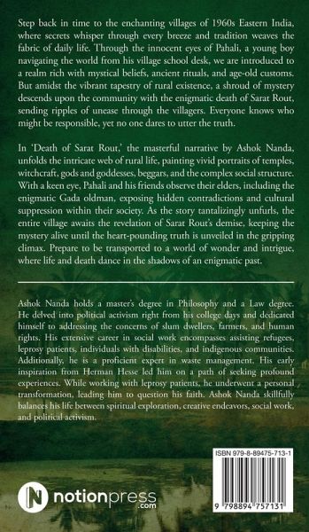 Step back in time to the enchanting villages of 1960s Eastern India, where secrets whisper through every breeze and tradition weaves the fabric of daily life. Through the innocent eyes of Pahali, a young boy navigating the world from his village school desk, we are introduced to a realm rich with mystical beliefs, ancient rituals, and age-old customs. But amidst the vibrant tapestry of rural existence, a shroud of mystery descends upon the community with the enigmatic death of Sarat Rout, sending ripples of unease through the villagers. Everyone knows who might be responsible, yet no one dares to utter the truth. In 'Death of Sarat Rout, ' the masterful narrative by Ashok Nanda, unfolds the intricate web of rural life, painting vivid portraits of temples, witchcraft, gods and goddesses, beggars, and the complex social structure. With a keen eye, Pahali and his friends observe their elders, including the enigmatic Gada oldman, exposing hidden contradictions and cultural suppression within their society. As the story tantalizingly unfurls, the entire village awaits the revelation of Sarat Rout's demise, keeping the mystery alive until the heart-pounding truth is unveiled in the gripping climax. Prepare to be transported to a world of wonder and intrigue, where life and death dance in the shadows of an enigmatic past.