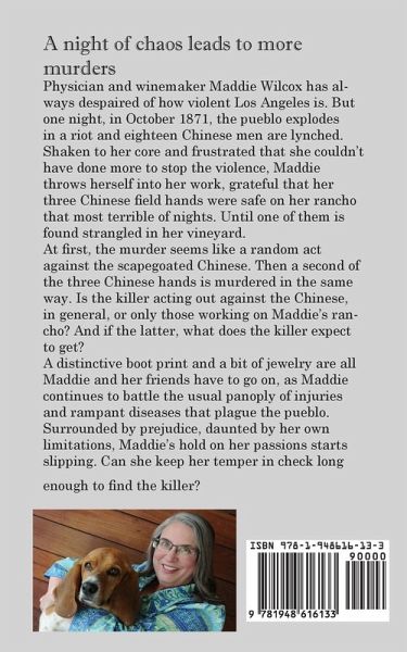 A night of chaos leads to more murders Physician and winemaker Maddie Wilcox has always despaired of how violent Los Angeles is. But one night, in October 1871, the pueblo explodes in a riot and eighteen Chinese men are lynched. Shaken to her core and frustrated that she couldn't have done more to stop the violence, Maddie throws herself into her work, grateful that her three Chinese field hands were safe on her rancho that most terrible of nights. Until one of them is found strangled in her vineyard. At first, the murder seems like a random act against the scapegoated Chinese. Then a second of the three Chinese hands is murdered in the same way. Is the killer acting out against the Chinese, in general, or only those working on Maddie's rancho? And if the latter, what does the killer expect to get? A distinctive boot print and a bit of jewelry are all Maddie and her friends have to go on, as Maddie continues to battle the usual panoply of injuries and rampant diseases that plague the pueblo. Surrounded by prejudice, daunted by her own limitations, Maddie's hold on her passions starts slipping. Can she keep her temper in check long enough to find the killer?
