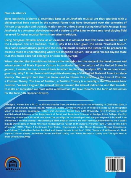 Blues Aesthetics Blues Aesthetics (Volume 3) examines Blues as an Aesthetic musical art that operates with a philosophical base rooted in the cultural forms that have developed over the centuries of African progression and transplantation to the United States during the Middle Passage. Blues Aesthetics is a construct developed put of a desire to offer Blues on the same level playing field reserved for other musical forms from other traditions. Using European Classical Music as an example, it is assumed that this form emanates out of the European fine art tradition. That is why it has been given the name "Classical Music". This name automatically gives one the idea the music requires the listener to be prepared to create mode of understanding where full attention is given. I have never heard anyone state that music does not belong to or come from Europe. When I decided that I would treat blues as the metaphor for the study of the development and advancement of Black Popular Culture is particular and the culture of the United Sates in general, I wanted to have a sound basis in which to place my analysis. With blues one cannot go wrong. Why? It has chronicled the political economy of the United States of American since slavery. The analytic tool that has been used to inform this process is the Law of Position, a Position Theory. The Law of Position, a Position Theory is a paradigm that has its basic premise, "we take as given the idea of distinction and the idea of indication, and that in order to make an indication we must make a distinction. We take therefore the form of distinction for the form.: (G. Spencer-Brown).