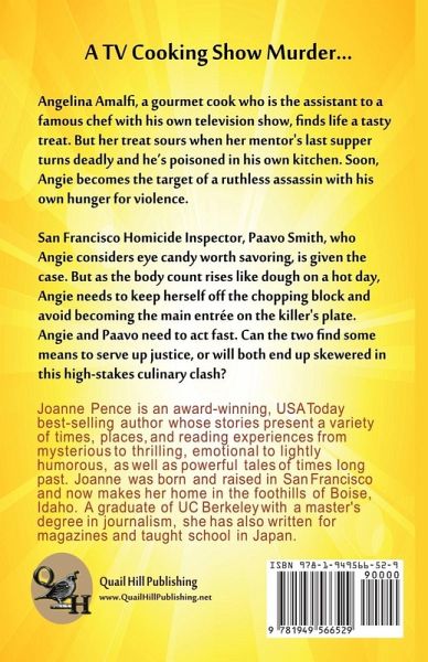 A TV cooking show murder- Angelina Amalfi, a gourmet cook who is also the assistant to a famous chef with his own television show, finds life a tasty treat. But her treat sours when her mentor's last supper turns deadly and he's poisoned in his own kitchen. Soon, Angie becomes the target of a ruthless assassin with his own hunger for violence. San Francisco Homicide Inspector, Paavo Smith, who Angie considers a delectable dish, is given the case. But as the body count rises like dough on a hot day, Angie struggles to avoid becoming the main entrée on the killer's plate. Angie and Paavo need to act fast. Can the two find some means to serve up justice, or will both end up skewered in this high-stakes culinary clash?