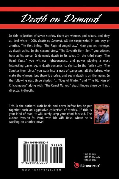 In this collection of seven stories, there are winners and takers, and they all deal with: --DOD, Death on Demand. All are suspenseful in one way or another. The first being, "The Rape of Angelina..." Here you see revenge, as death waits. In the second story, "The Seventh Born Son," you witness hate at its worse. It demands death to its taker. In the third story, "The Dead Vault," you witness righteousness, and power playing a most interesting game, again death demands its rights. In the forth story, "The Senator from Lima," you walk into a nest of gangsters, all the takers, who make the winners, but there is a price, and again death is on the menu. In the following next three stories, "... Tides of Winter," and "The Old Man of Chickamauga" along with, "The Camel Market," death lingers close by, if not directly, indirectly.