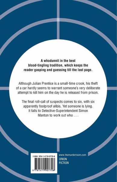 A whodunnit in the best blood-tingling tradition, which keeps the reader gasping and guessing till the last page. Although Julian Prentice is a small-time crook, his theft of a car hardly seems to warrant someone's very deliberate attempt to kill him on the day he is released from prison. The final roll-call of suspects comes to six, with six apparently foolproof alibis. Yet someone is lying. It falls to Detective-Superintendent Simon Manton to work out who ...