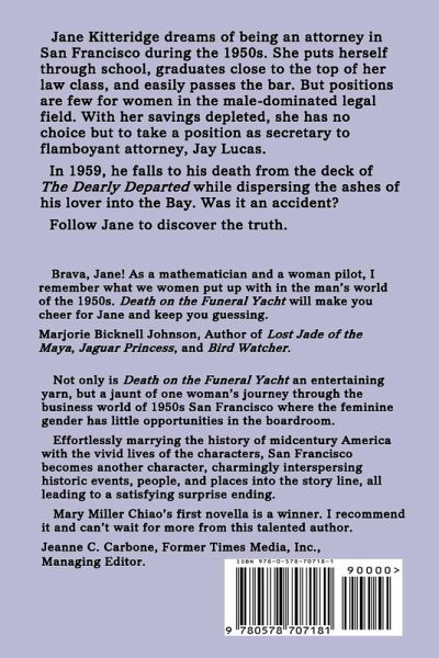 Jane Kitteridge dreams of being an attorney in San Francisco during the 1950s. She puts herself through school, graduates close to the top of her law class, and easily passes the bar. But positions are few for women in the male-dominated legal field. With her savings depleted, she has no choice but to take a position as secretary to flamboyant attorney, Jay Lucas. In 1959, he falls to his death from the deck of The Dearly Departed while dispersing the ashes of his lover into the Bay. Was it an accident? Follow Jane to discover the truth.