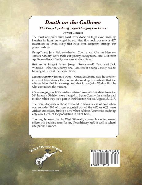 The most comprehensive work ever done on legal executions by hanging in Texas. Arranged by counties, this book documents 467 executions in Texas, many that have been forgotten through the years. Such as: Decapitated: Jack Fields—Wharton County, and Charles Myers— Tarrant County were both completely decapitated and Clemente Apolinar—Bexar County was almost decapitated. Had to be hanged twice: Joseph Brewster—El Paso and Jack Williams—Wharton County, and Jack Post of Young County had to be hanged twice at their executions. Famous Hanging: Joshua Bowen—Gonzales County was the brother-in-law of John Wesley Hardin and declared up to his death that the witness identified him wrong, and that it was John Wesley Hardin who committed the murder. Mass Hanging: In 1917, thirteen African American soldiers from the 24th Infantry Division were hanged in Bexar County for murder and mutiny, when they took part in the Houston riot on August 23, 1917. The racial disparity of those executed in Texas is also of note when you consider 280 of those executed out of the 467, or 60% were African American, during a time when African Americans made up only about 22% of the population in all of Texas. Thoroughly researched by West Gilbreath, a career law enforcement officer, this book is a must for any Texas history buff, as well as school and public libraries.