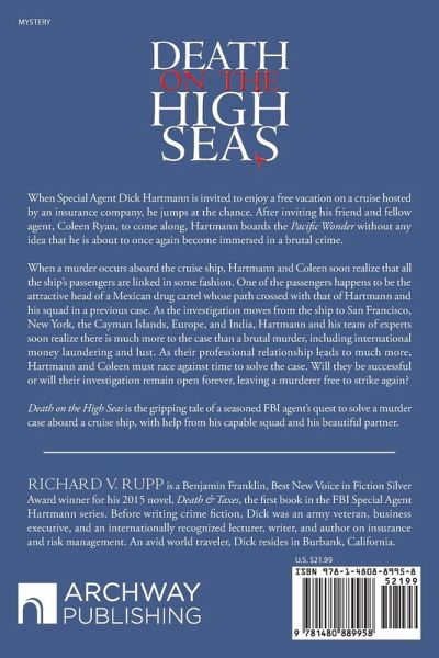 When Special Agent Dick Hartmann is invited to enjoy a free vacation on a cruise hosted by an insurance company, he jumps at the chance. After inviting his friend and fellow agent, Coleen Ryan, to come along, Hartmann boards the Pacific Wonder without any idea that he is about to once again become immersed in a brutal crime. When a murder occurs aboard the cruise ship, Hartmann and Coleen soon realize that all the ship's passengers are linked in some fashion. One of the passengers happens to be the attractive head of a Mexican drug cartel whose path crossed with that of Hartmann and his squad in a previous case. As the investigation moves from the ship to San Francisco, New York, the Cayman Islands, Europe, and India, Hartmann and his team of experts soon realize there is much more to the case than a brutal murder, including international money laundering and lust. As their professional relationship leads to much more, Hartmann and Coleen must race against time to solve the case. Will they be successful or will their investigation remain open forever, leaving a murderer free to strike again? Death on the High Seas is the gripping tale of a seasoned FBI agent's quest to solve a murder case aboard a cruise ship, with help from his capable squad and his beautiful partner.