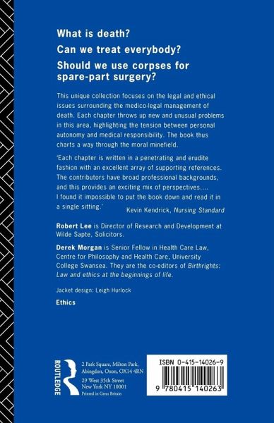 The increasing capacity of medicine to intervene to save lives demands that we ask more and more questions about what death is, and why it matters. This series of studies on law, ethics and medicine contributes to the debate on when and how it is permissable to terminate life, to warn of death, and to deal with tragedy in its aftermath. The essays are wide-ranging, provocative and timely. Accessible to those from the worlds of both law and medicine, this work focuses uniquely upon an issue which is increasingly significant for both sets of practitioners.