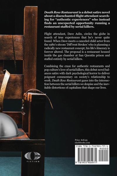 Death Row Restaurant is a debut satire novel about a disenchanted flight attendant searching for "authentic experiences" who instead finds an unexpected opportunity running a restaurant staffed by serial killers.Flight attendant, Dave Aslin, circles the globe in search of true experiences that he's never quite found. When Dave meets a canceled child actor from the 1980’s sitcom ‘Diff’rent Strokes’ who is planning a radically new restaurant concept, his life's itinerary is forever altered. The proposal is a restaurant housed inside the gas chamber at San Quentin prison and staffed entirely by serial killers. Combining the craze for authentic restaurants and pop culture’s love of serial killers, this debut novel balances satire with dark psychological horror to deliver poignant commentary on society’s relationship to work. Death Row Restaurant gazes into the intersection between the serial killers we despise and the inevitable distortions of capitalism that shape our lives.