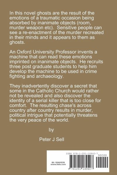 In this novel ghosts are the result of the emotions of a traumatic occasion being absorbed by inanimate objects (room, murder weapon etc). Sensitive people can see a re-enactment of the murder recreated in their minds and it appears to them as ghosts. An Oxford professor invents a machine that can read these emotions imprinted on inanimate objects. He recruits 3 post graduate students to help him develop the machine to be used in crime fighting and archaeology. They inadvertently discover a secret that some in the Catholic Church would rather not be revealed and they also discover the identity of a serial killer that is too close for comfort. The resulting chases across country after country results in murder and political intrigue that potentially threatens the very peace of the world.