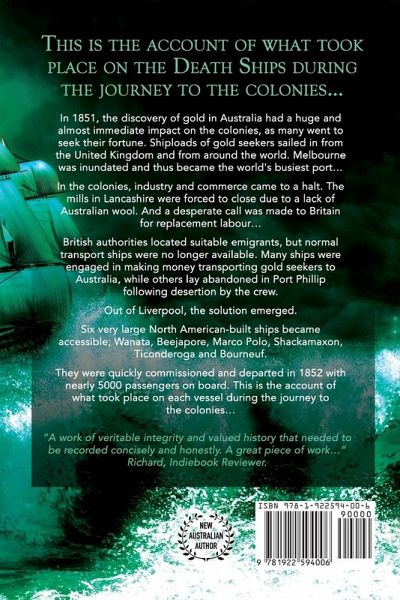 This is the account of what took place on the Death Ships during the journey to the colonies... In 1851, the discovery of gold in Australia had a huge and almost immediate impact on the colonies, as many went to seek their fortune. Shiploads of gold seekers sailed in from the United Kingdom and from around the world. Melbourne was inundated and thus became the world's busiest port... In the colonies, industry and commerce came to a halt. The mills in Lancashire were forced to close due to a lack of Australian wool. And a desperate call was made to Britain for replacement labour... British authorities located suitable emigrants, but normal transport ships were no longer available. Many ships were engaged in making money transporting gold seekers to Australia, while others lay abandoned in Port Phillip following desertion by the crew. Out of Liverpool, the solution emerged. Six very large North American-built ships became accessible; Wanata, Beejapore, Marco Polo, Shackamaxon, Ticonderoga and Bourneuf. They were quickly commissioned and departed in 1852 with nearly 5000 passengers on board. This is the account of what took place on each vessel during the journey to the colonies... "A work of veritable integrity and valued history that needed to be recorded concisely and honestly. A great piece of work..." Richard, Indiebook Reviewer.