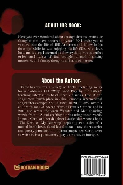 Have you ever wondered about strange dreams, events, or thoughts that have occurred in your life? I invite you to venture into the life of Bill Anderson and follow in his footsteps while he was enjoying his life filled with love, lust, and luxury. It seemed as if everything was in perfect order until twists of fate brought turmoil, haunting memories, and finally, thoughts and acts of horror.