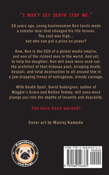 "I won't let death stop me." 25 years ago, young businessman Ron Jarvis made a sinister deal that changed his life forever. The cost was high... but who can put a price on power? Now, Ron is the CEO of a global media empire, and one of the richest men in the world. And yet, to help his daughter, Ron will once more seek out the architect of that hideous pact, bringing death, despair, and total destruction to all around him in a jaw-dropping frenzy of outrageous, bloody carnage. With Death Spell, David Sodergren, author of Maggie's Grave and Rotten Tommy, will once more plunge you into the depths of insanity and depravity. You have been warned!