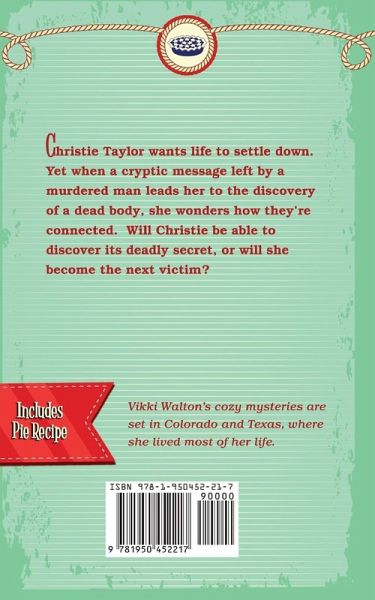 Christie Taylor is hoping things are going to settle down in Comfort. While helping out new friend, Lana, Christie finds herself drawn back into the death surrounding Lana's father. When Christie discovers a dead body, she works with Lana to find out what happened. But someone has something they're seeking and Christie is in their way. Can they figure out the cryptic message left by Lana's father or will the killer seek to silence her first? Christie Taylor, the pie-baking sleuth, is at it again in the third book in the Taylor Texas Mystery series. Pie Recipe included.