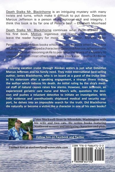 A Relaxing vacation cruise through Alaskan waters is just what Detective Marcus Jefferson and his family needs. They meet International best-selling author, James Blackthorne, who is on board as a guest of the cruise line. In his stateroom after a speaking engagement, a strange illness strikes the author which induces his death. An initial ruling by the ship's medical staff of natural causes raises few alarms. However, Joan Jefferson, an experienced geriatric nurse and Marc's wife, questions the decision and pushes a reluctant detective to initiate an investigation. With little evidence and unenthusiastic shipboard medical and security support, he delves into an impossible search for the truth. Did Blacthorne die naturally or become a victim like a character in one of his own books?