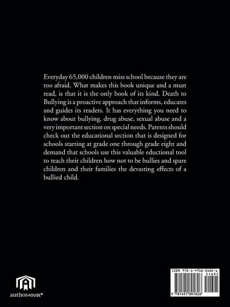 Everyday 65,000 children miss school because they are too afraid. What makes this book unique and a must read, is that it is the only book of its kind. Death to Bullying is a proactive approach that informs, educates and guides its readers. It has everything you need to know about bullying, drug abuse, sexual abuse and a very important section on special needs. Parents should check out the educational section that is designed for schools starting at grade one through grade eight and demand that schools use this valuable eductional tool to teach their children how not to be bullies and spare children and their families the devasting effects of a bullied child.